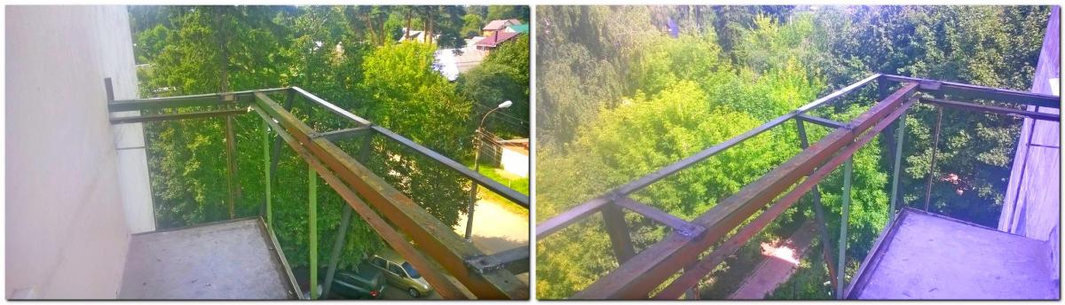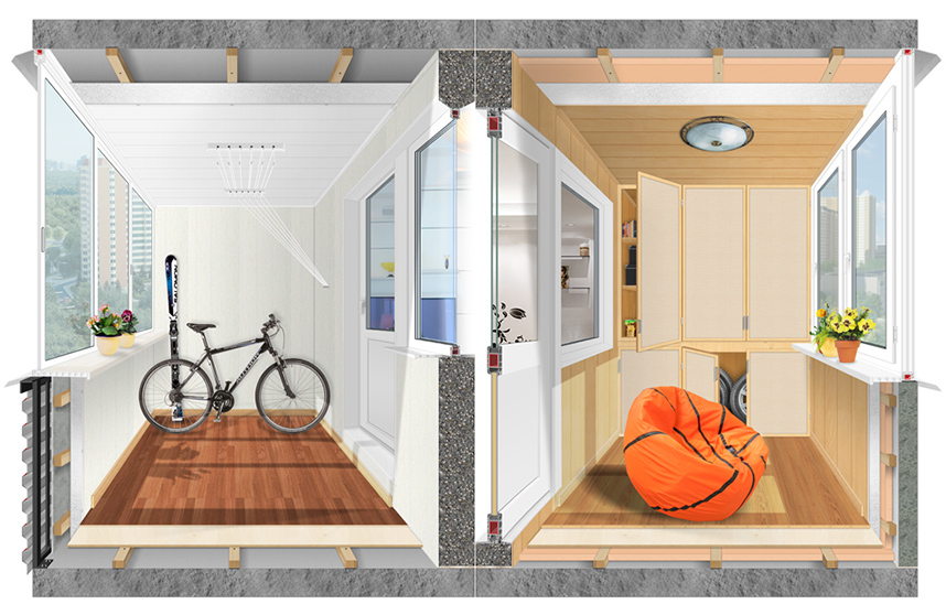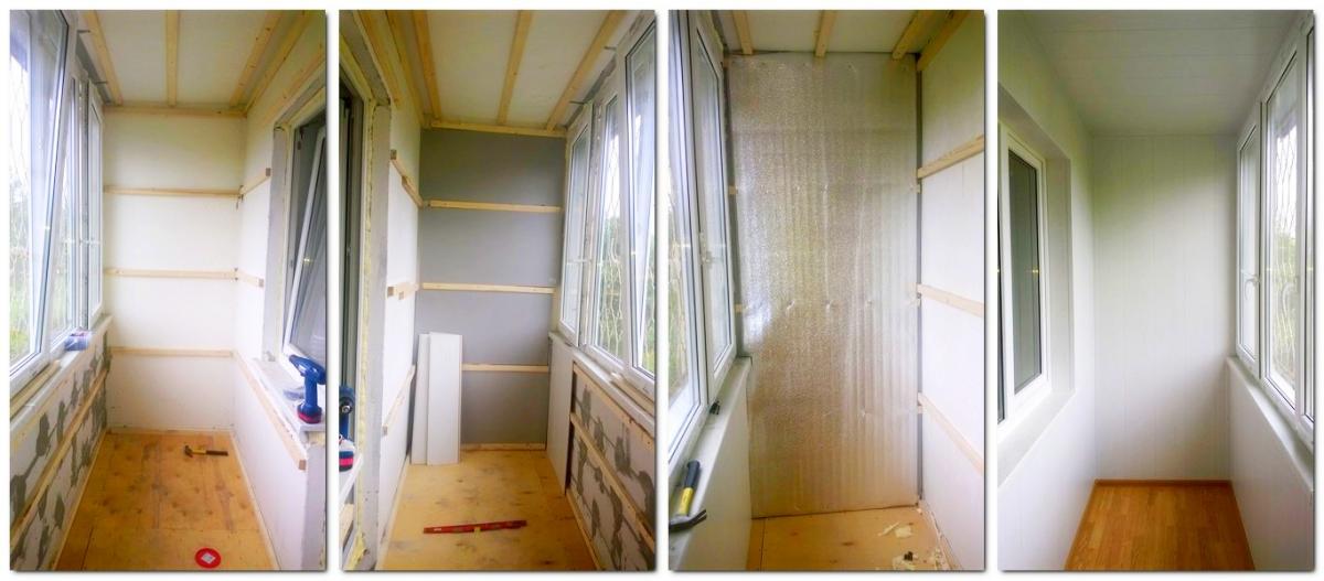 Работы по отделке балконов и лоджий выполняются в двух вариантах, с утеплением и без утепления. На выносной балкон стандартного типа, с металлическим парапетом, внешняя сторона (уличная) закрывается щитом из панелей сайдинг, либо применяются материалы ввиде пластиковой вагонки. Внутреняя сторона парапета, стены балкона и потолок отделываются панелями ПВХ, в зависимости от стоимости и палитры цветов, по желанию заказчика. Полы балкона выравниваются брусками, покрываются фанерой и линолиумом, ламинатом, либо зашиваются половой доской.